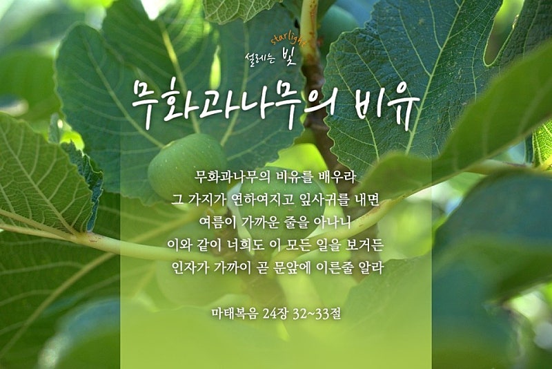 여름이 가까운 줄을 아나니 이와 같이 너희도 이 모든 일을 보거든 인자가 가까이 곧 문 앞에 이른 줄 알라